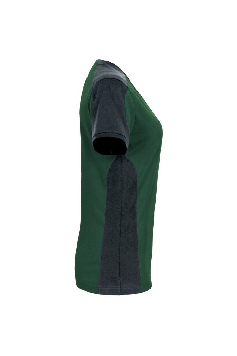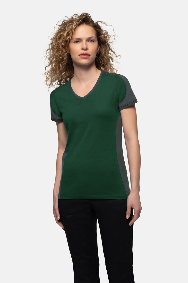 HAKRO Damen V-Shirt Contrast MIKRALINAR® 190 tanne/anthrazit , XS •Besonders strapazierfähiges T-Shirt mit Einsätzen in Kontrastfarbe Anthrazit an den Seiten, Schultern und Ärmeln, sowie kontrastfarbigen, gerippten Bündchen an V-Ausschnitt und Ärmeln. Nackenband, Leasingkoller zur einfachen Kennzeichnung in der gewerblichen Wäscherei und Aufhängebänder im Saum. Mittelschwerer, besonders pflegeleichter und funktioneller Single-Jersey aus MIKRALINAR®, dem HAKRO Performance-Materialmix aus Baumwolle und Polyester. Verfügbar auch als Unisexmodell mit Rundhalsausschnitt. Normale Passform: Regular Fit. • Material: MIKRALINAR®, Single-Jersey aus 50 % Baumwolle und 50 % Polyester • Gewicht: 160 g/m² • Eigenschaft: einlaufvorbehandelt, pflegeleicht, geeignet für Industriewäsche nach DIN EN ISO 15797 • Passform: Regular Fit • Siegel: Fair Wear Leader, ClimatePartner zertifiziertes Produkt, OEKO-TEX® STANDARD 100 • Waschtemperatur: 60 °C • Größen: XS-6XL